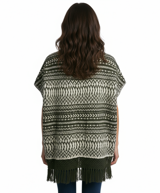 Skies Are Blue Tribal Pattern Open Poncho with Fringe