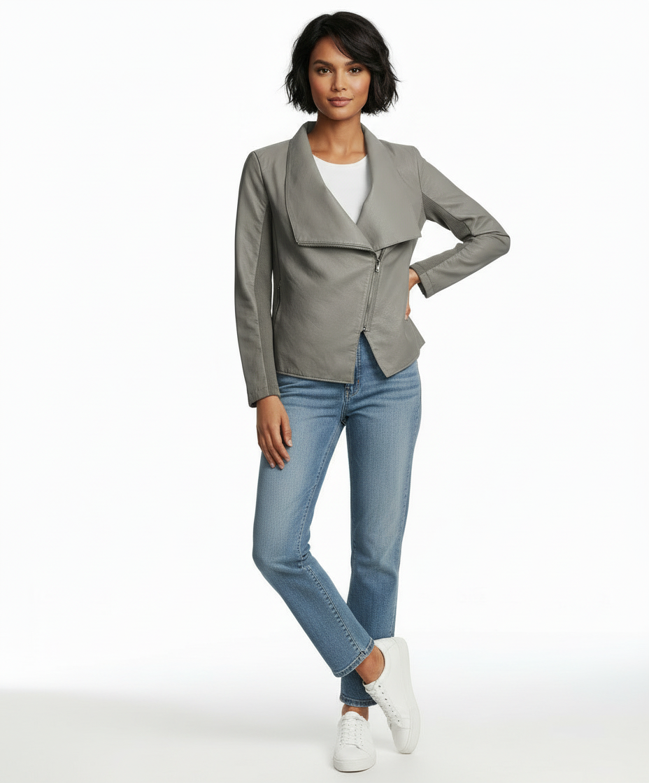 Add a touch of modern edge to your wardrobe with this chic moto-style BB Dakota Gabrielle Faux Leather Jacket. The design features a distinctive asymmetrical zipper closure and oversized, draped lapels that create a sophisticated neckline. Crafted for comfort and fit, it incorporates ribbed knit panels along the inner sleeves and sides to ensure flexibility and a contoured silhouette. Perfect for layering, this versatile piece pairs effortlessly with denim for a casual look or tailored trousers for a polished, contemporary ensemble.